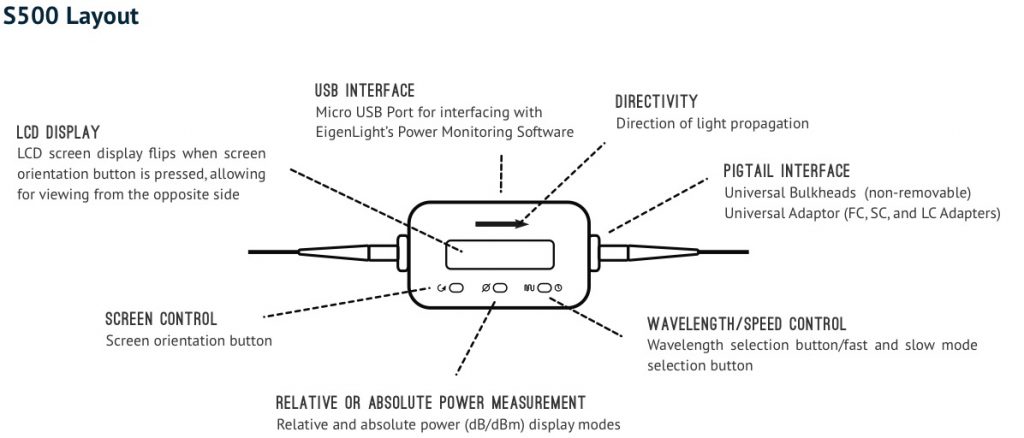 The M500 comes either in high sensitivity mode (-50 – 16dBm) or in high power mode (-40 – +25dBm). It can either be calibrated at 1550nm only or at 1310/1480/1550nm.
